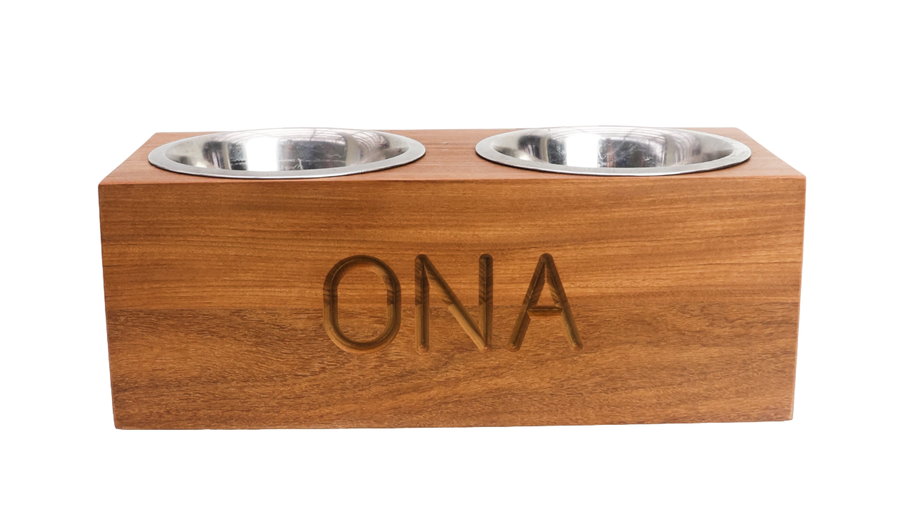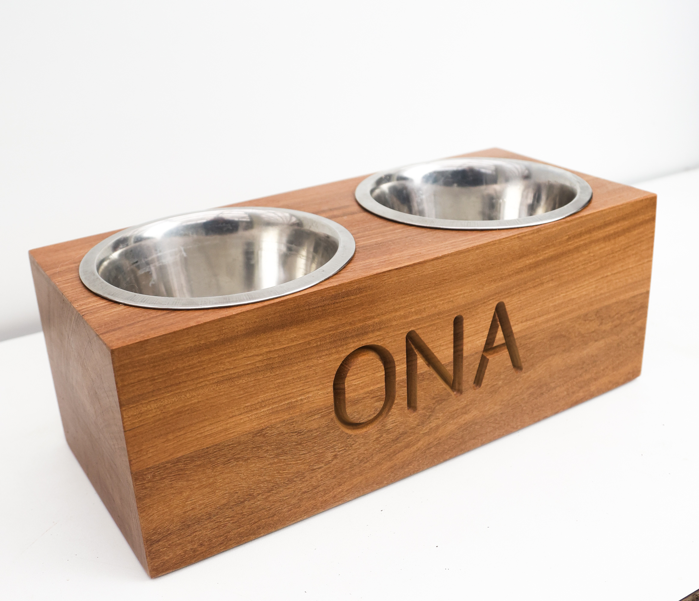 Gepersonaliseerde massiefhouten dierenvoederbak.